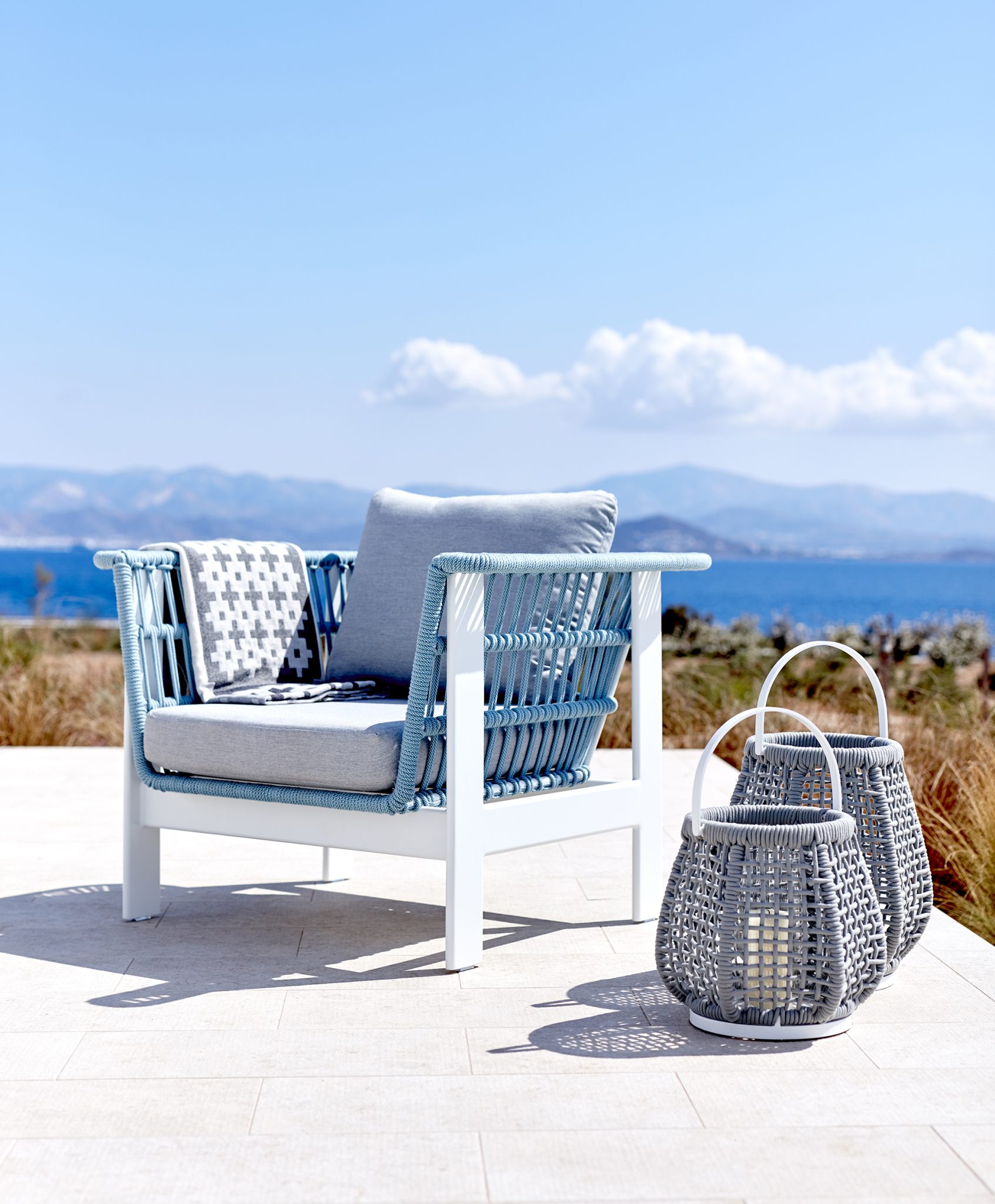 This sofa collection merges lacquered aluminum with rope to give it a nest-like feeling of coziness and security. The rope wraps around the frame creating openings that allow ventilation, perfect for hotter climates.