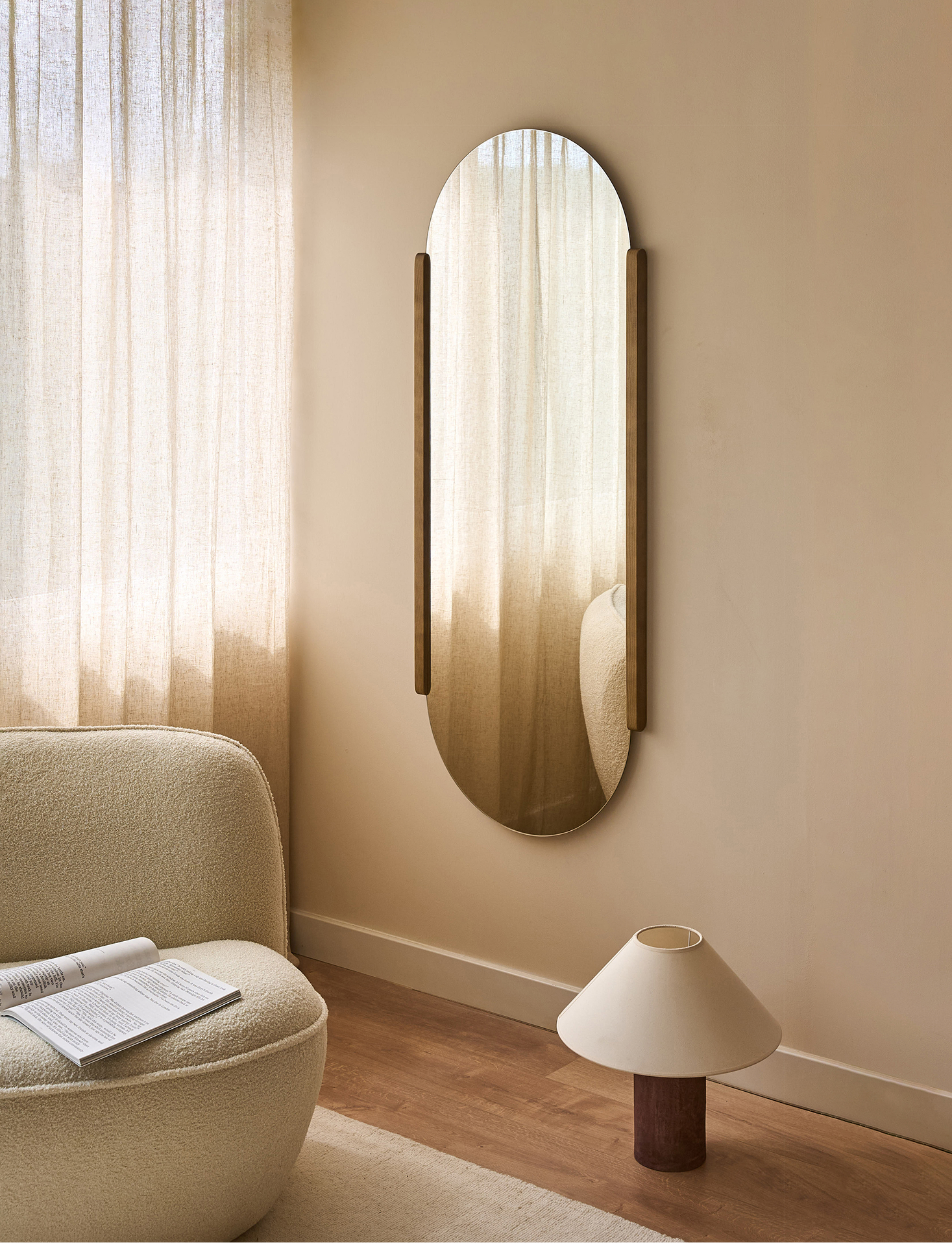 Made with a discreet solid fir wood frame that enhances its elongated oval shape, creating a piece that stands out for its simplicity and style. Sophisticated and versatile piece.