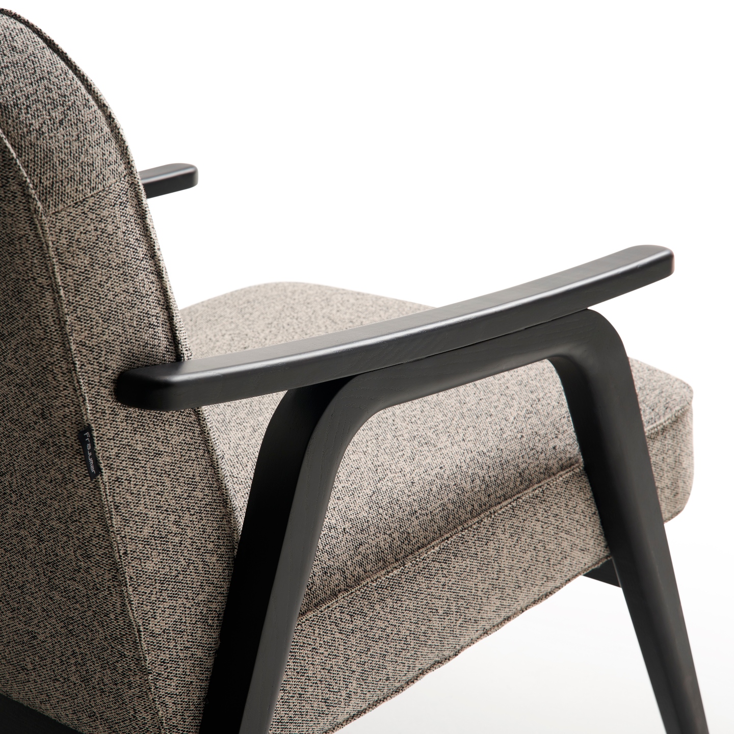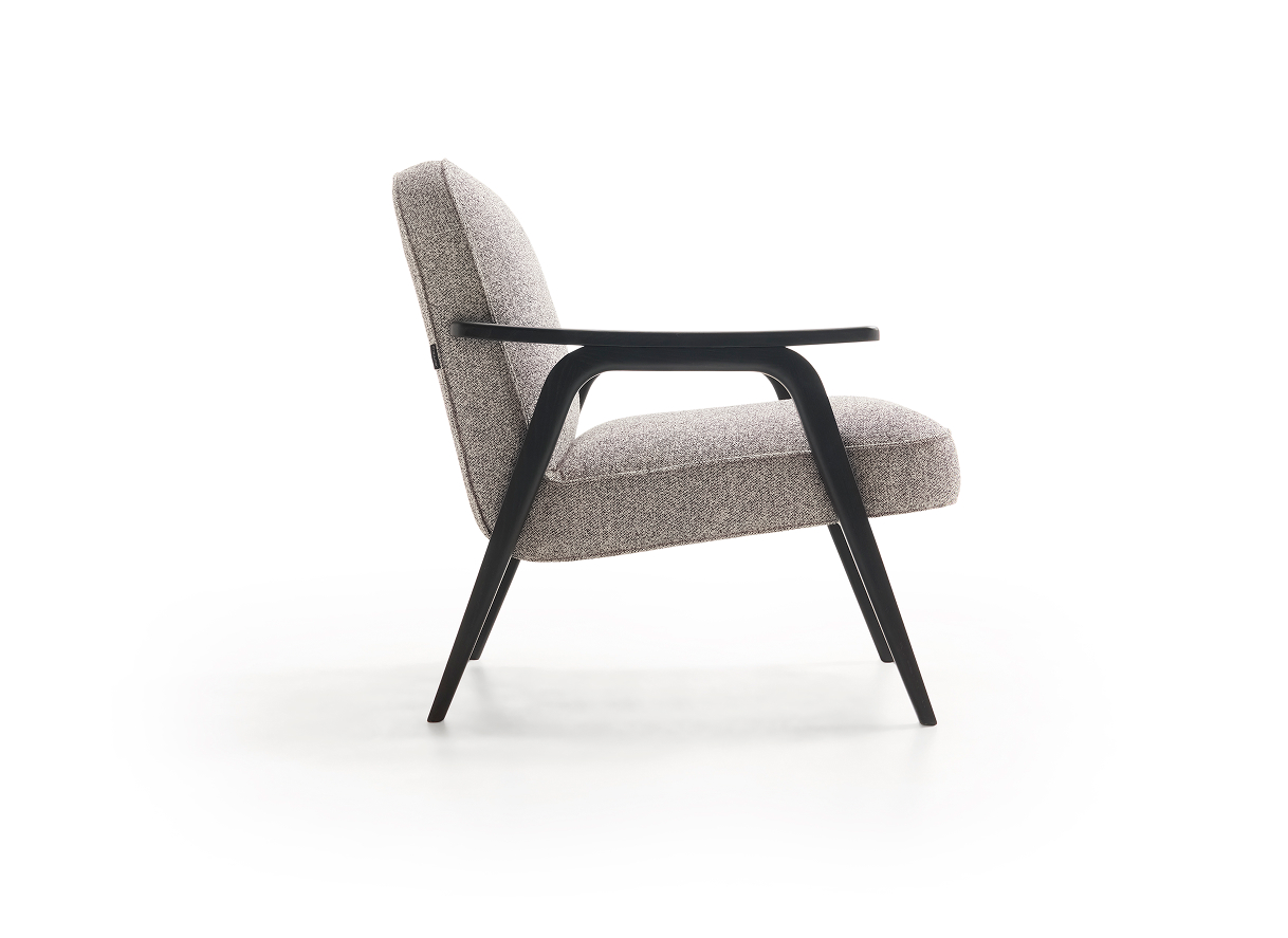 This armchair fuses contemporary design with timeless elegance. Its solid wood structure, with angled lines and dark-tone finishes, provides a sophisticated soft seating for the contract sector.