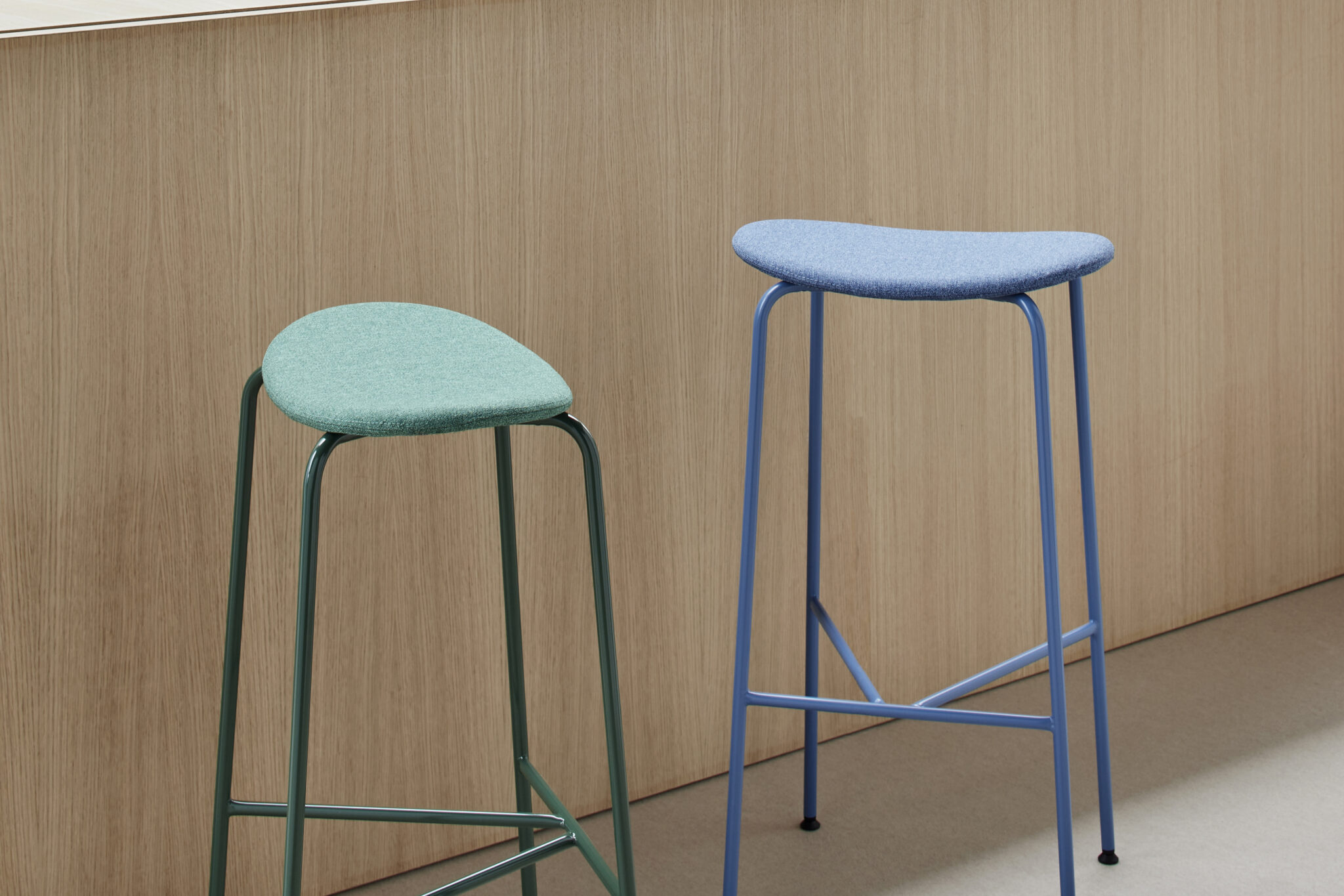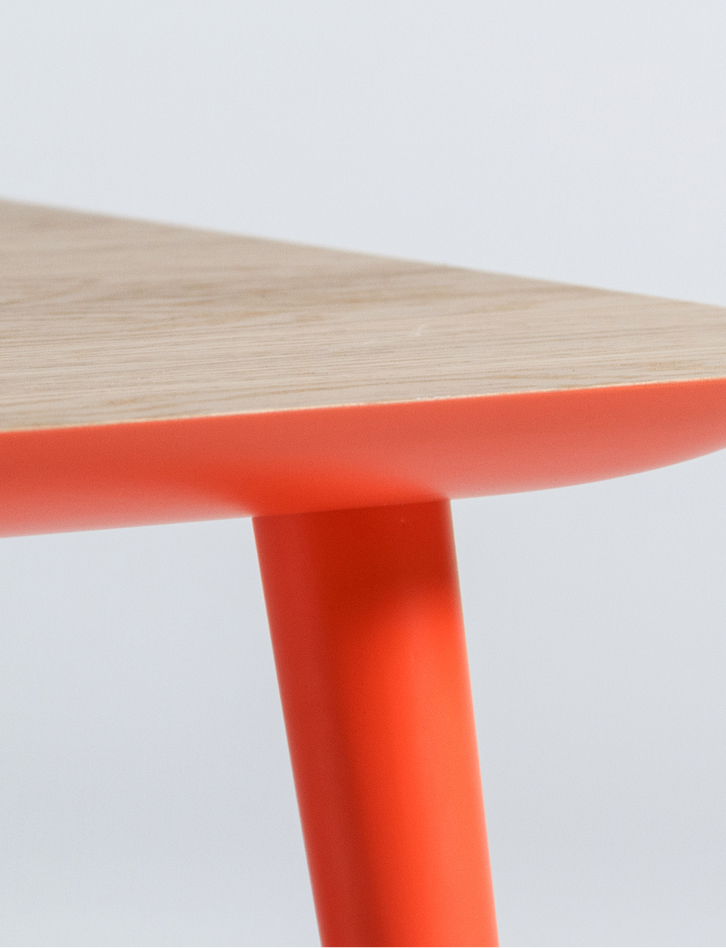 A family of stools with an eye-catching outline. Its oval, organic seat contrasts with its triangular metal structure to give it a strong personality. This is a lightweight stool for the contract sector.