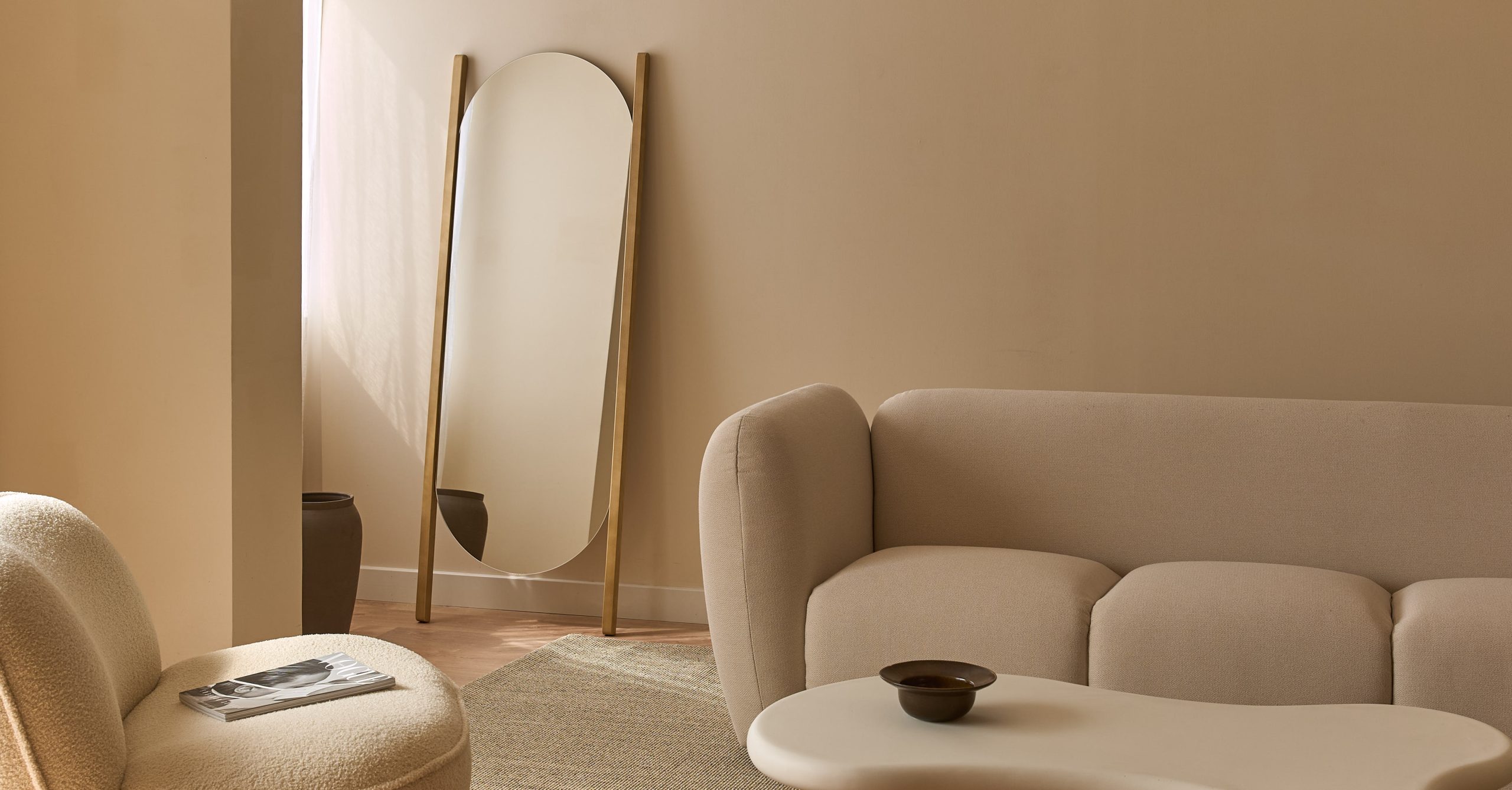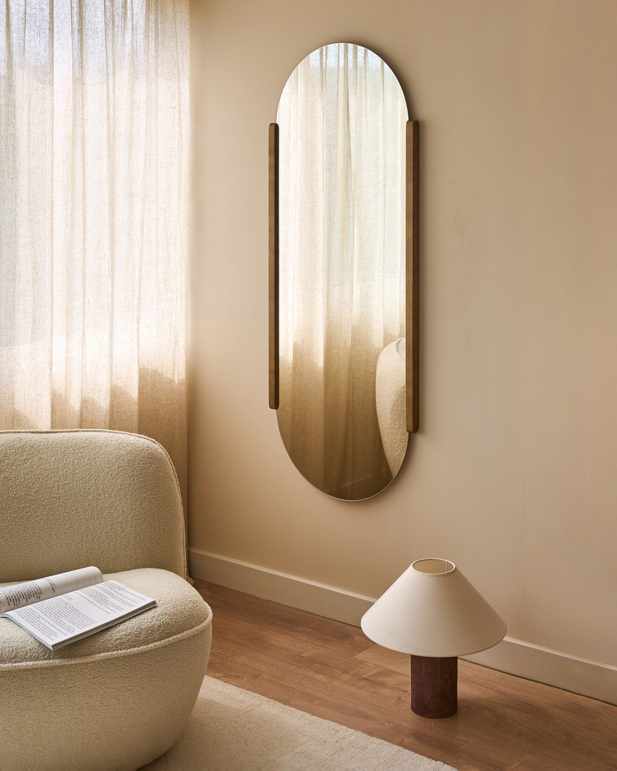 The Dena mirror is made with a discreet solid fir wood frame that enhances its elongated oval shape, creating a piece that stands out for its simplicity and style. Its compact version is perfect for spaces like entryways or living rooms, while its full-body size is ideal for dressing rooms, bedrooms, or any place where you need a complete view.