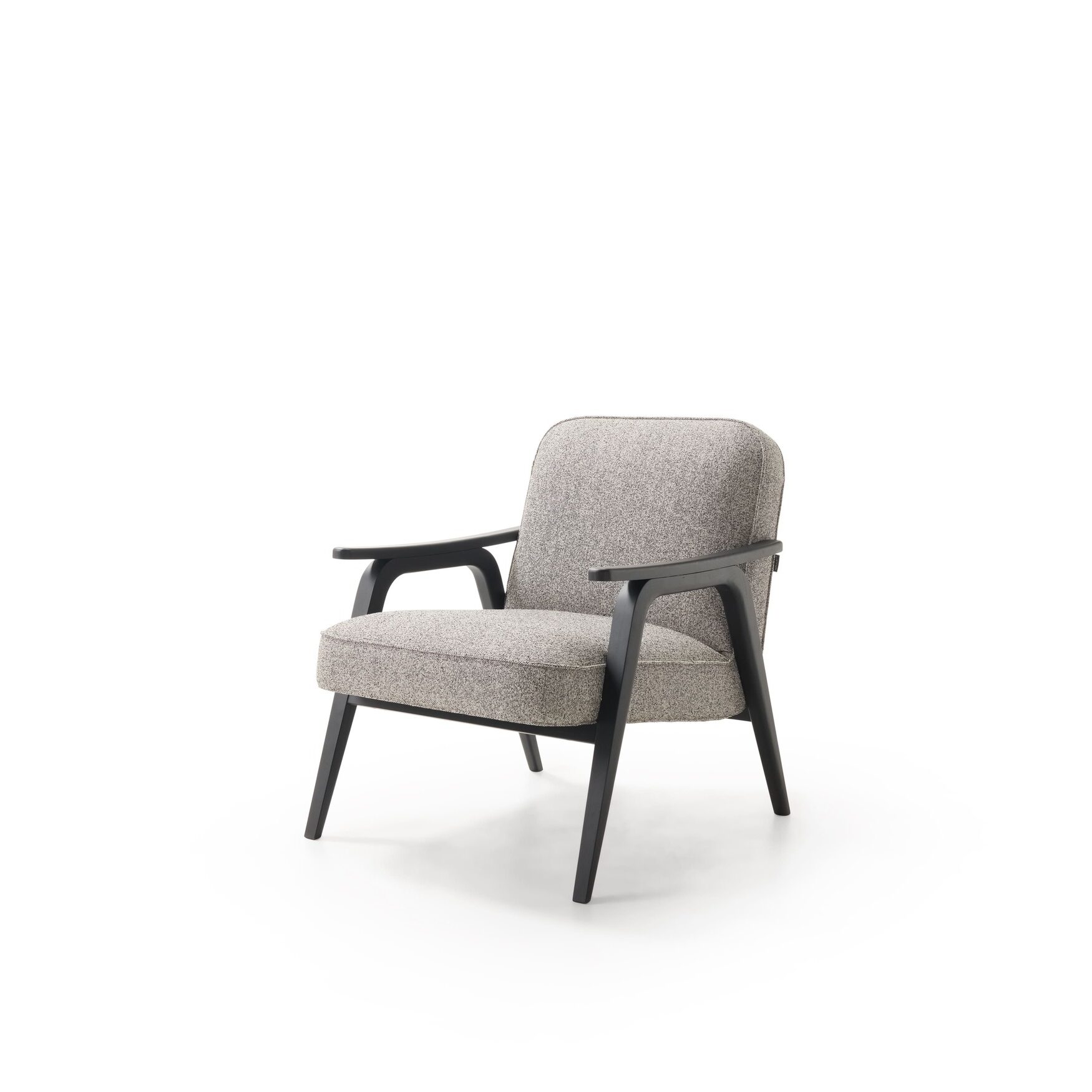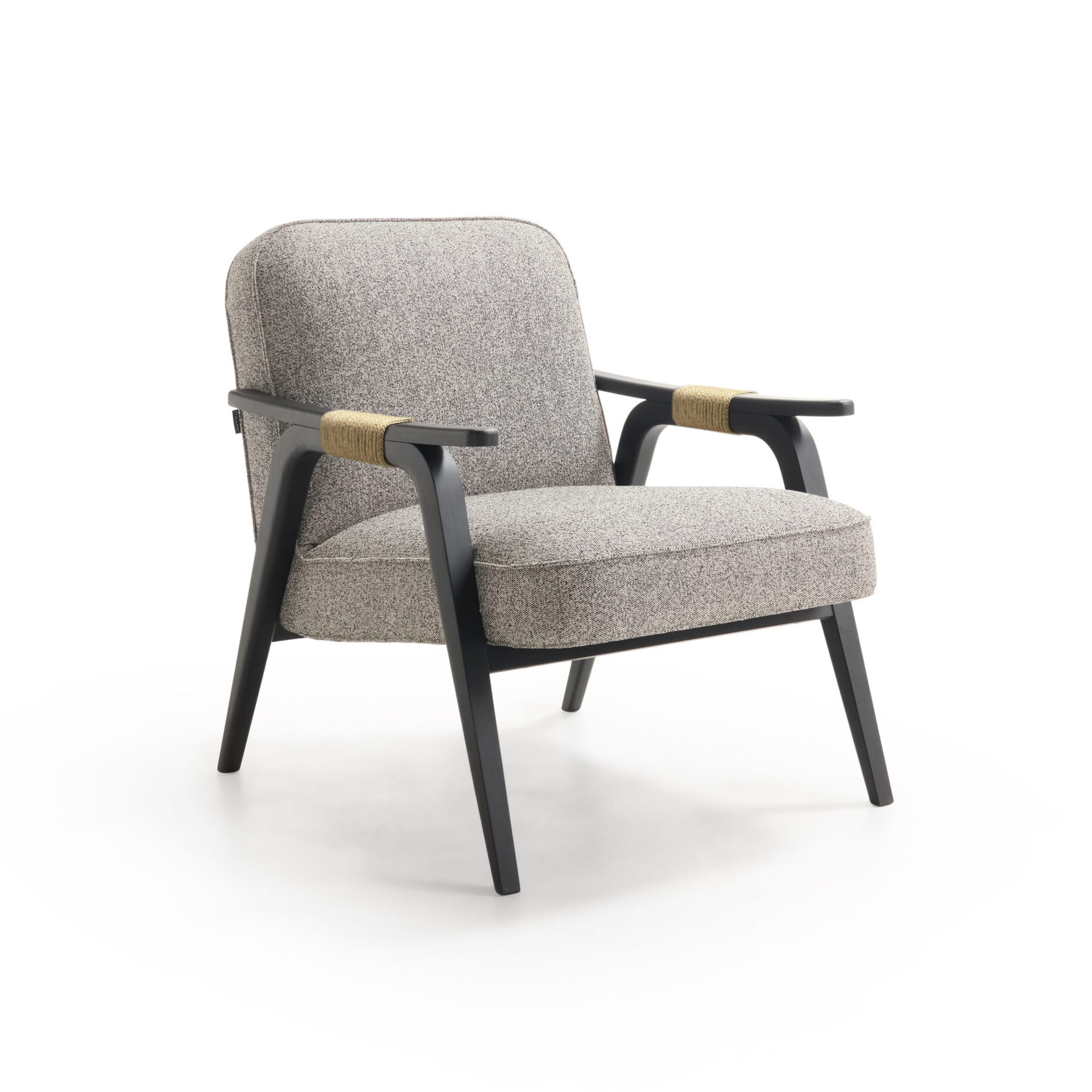 This armchair fuses contemporary design with timeless elegance. Its solid wood structure, with angled lines and dark-tone finishes, provides a sophisticated soft seating for the contract sector.